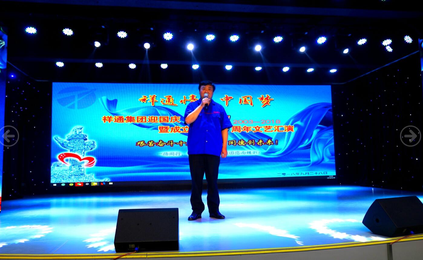 朗月中秋來,金風(fēng)迎國慶;祥通十五載,萬里豪情在。在祖國母親六十九歲華誕即將到來之際,山東祥通集團(tuán)也迎來自己成立十五周年的紀(jì)念日。為回首過往,繼往開來,9月28日下午,一場以“ 祥通情·中國夢”為主題的大型文藝匯演活動在祥通集團(tuán)演播大廳隆重舉行。山東祥通集團(tuán)董事長張建魯先生,經(jīng)濟(jì)顧問華力集團(tuán)董事長鄭元華先生、龍儒秋先生、孫向軍先生、楊尊甫先生;文化顧問濟(jì)寧市文聯(lián)原主席、中國著名書法家王道雨先生,山東省書法家協(xié)會副主席、濟(jì)寧市書協(xié)主席、中國著名書法家、篆刻家謝長偉先生,中國著名作家、詩人、書畫家賀文鍵先生,濟(jì)寧市作家協(xié)會副秘書長、任城區(qū)作家協(xié)會副主席、中國著名作家紀(jì)廣洋先生,大魯藝書畫院副院長、知名書法家張瑞祥先生,大魯藝書畫院副院長、知名畫家王盡文先生;集團(tuán)勞動模范和先進(jìn)工作者代表;集團(tuán)各分公司負(fù)責(zé)人和員工代表及媒體記者代表近500人出席了慶祝活動。