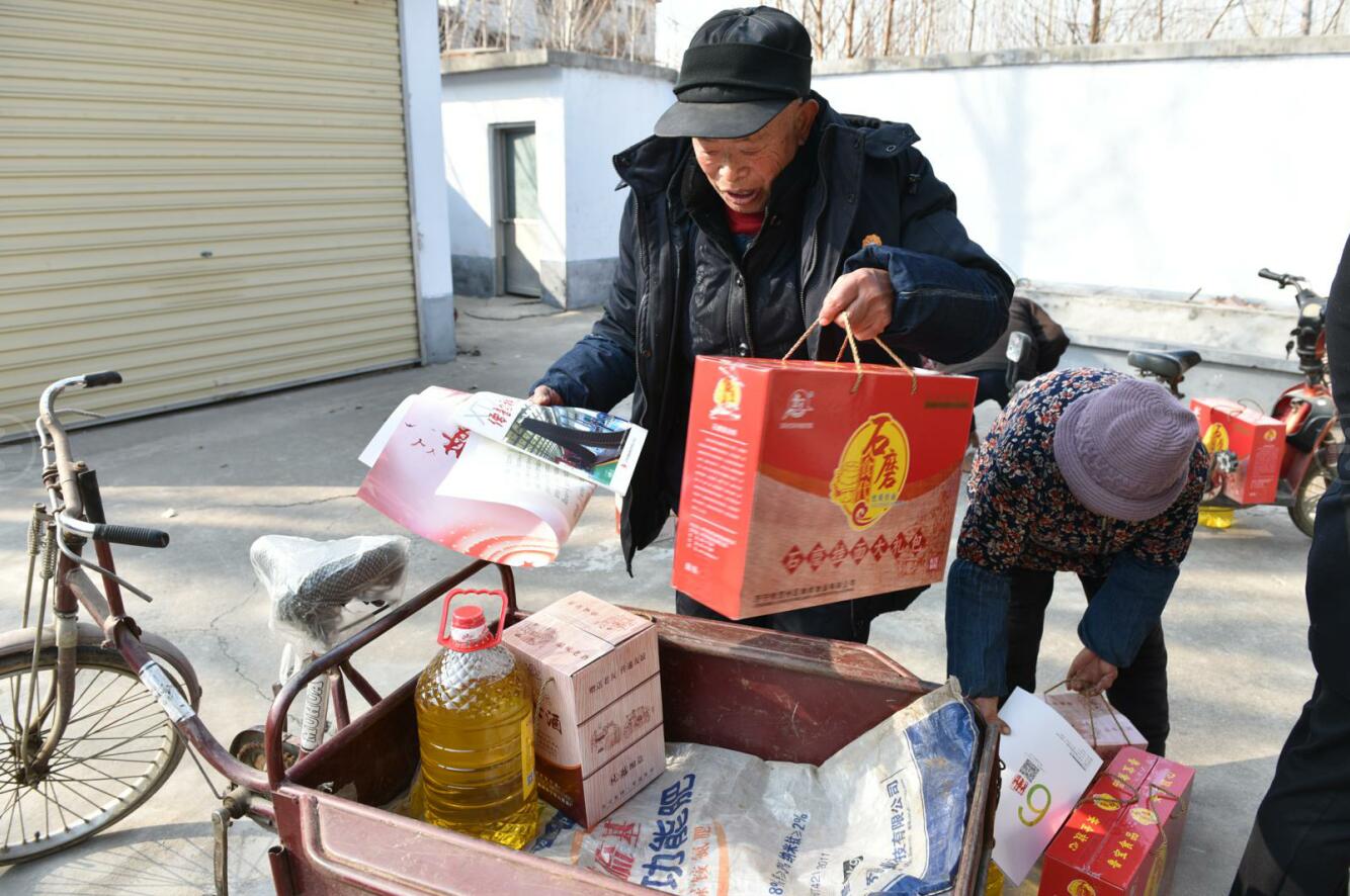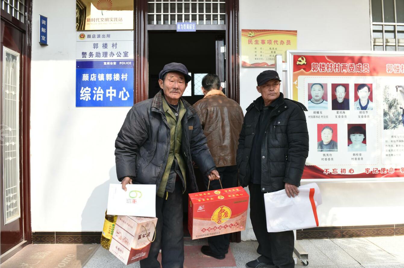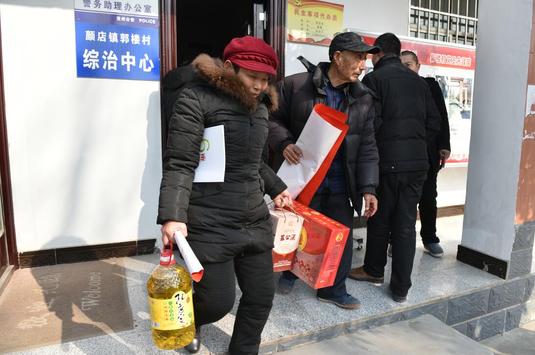 與此同時,郭家樓村黨支部書記胡耀龍一邊招呼村委人員卸福利,一邊通過廣播通知符合條件的老年人來村委會領取福利。祥通集團還為該村82位70周歲以上的老年人送去了大豆油、20年珍藏莊公酒、石磨面和祥通文化年貨,讓老人們歡歡喜喜地過大年。隨后,在村支部書記胡耀龍的帶領下我們拿上油、酒水、面條和書畫家們現(xiàn)場寫的春聯(lián)來到了村里退休教師胡伯柱家。在胡老師家的客廳,我們了解了他退休后的生活和家中的情況,并提前向他和家人拜年! 隨后,我們慰問小分隊一行又來到村民胡伯民家,在他家大門口書畫家們將散發(fā)著濃濃墨香的春聯(lián)和福字送到了他的手上,并向他和家人提前拜年!