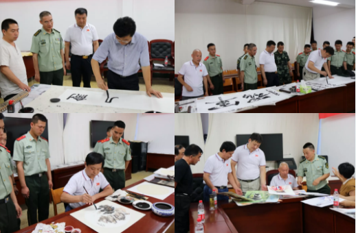 創(chuàng)作開始前先舉行了短暫的座談會,武警濟寧支隊政委房石磊和市作家協(xié)會主席張建魯、市書法家協(xié)會主席謝長偉分別介紹了雙方情況。書法家們對于武警支隊在抗洪搶險、救災應急、服務群眾、維護穩(wěn)定等方面作出的貢獻深表感謝。房政委代表全體官兵,對市書協(xié)、作協(xié)一行的到來表示熱烈歡迎,對藝術(shù)家們的書畫創(chuàng)作表示感謝!并向大家介紹了部隊的基本情況、建設(shè)狀況以及在配合地方開展工作等方面的情況。市作協(xié)主席張建魯表示,聽了房政委的介紹,結(jié)合部隊的訓練情況,我們感到武警支隊是一支有戰(zhàn)斗力的部隊,是一支能打勝仗的部隊,我們?yōu)橛羞@樣一支威武之師感到自豪,他說,在八一建軍節(jié)即將到來之際,我們開展這次活動,就是要把好的文學藝術(shù)作品獻給我們新時代最可愛的人,表達文藝界對部隊的感激之情,進一步加深軍地濃厚的魚水情。