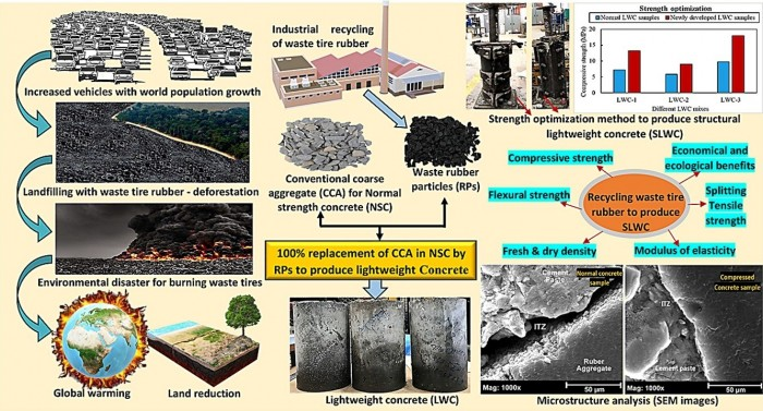 與用傳統(tǒng)方法生產(chǎn)的100%輪胎骨料混凝土相比,新混凝土的抗壓、抗折和抗拉強(qiáng)度分別提高了97%、59%和20%。