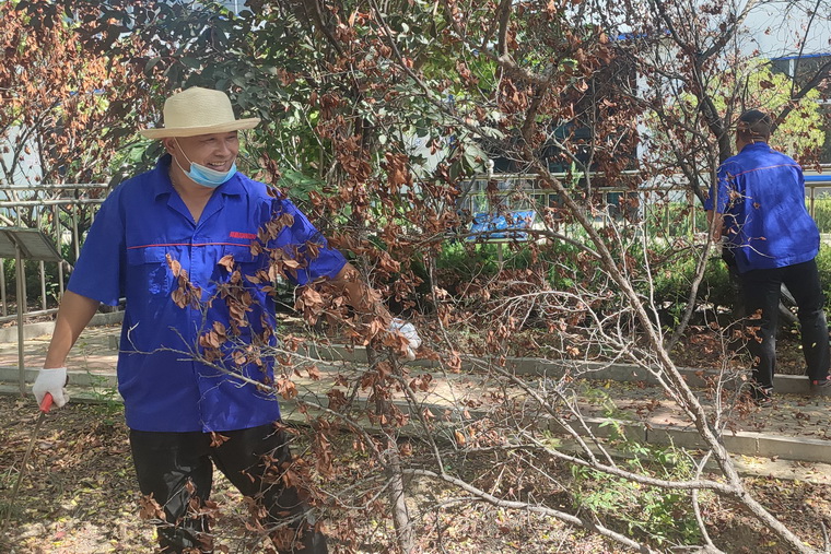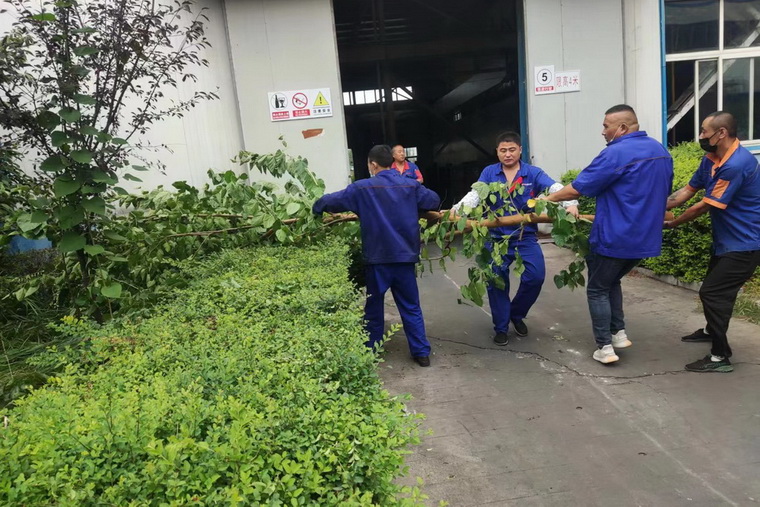 在勞動(dòng)中,員工們分工明確,有的手持電鋸把枯死的樹枝鋸掉,有的在樹下把鋸下的枯樹枝搬運(yùn)走,大家干的是熱火朝天,共同為廠區(qū)的綠化、公司的環(huán)境整潔作出貢獻(xiàn),整個(gè)廠區(qū)看起來不僅干凈而且整潔舒適。