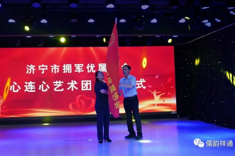 濟(jì)寧市退役軍人事務(wù)局正縣級(jí)干部、濟(jì)寧市擁軍優(yōu)屬協(xié)會(huì)會(huì)長(zhǎng)于彥柱為心連心藝術(shù)團(tuán)授旗