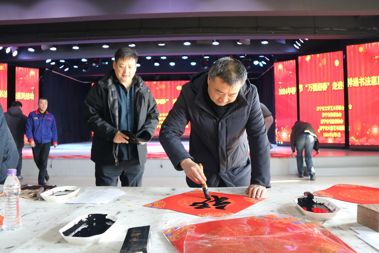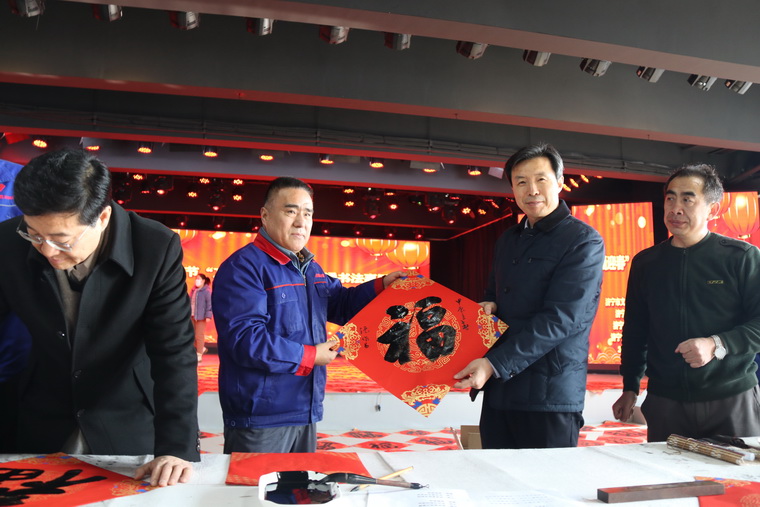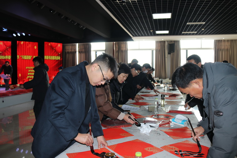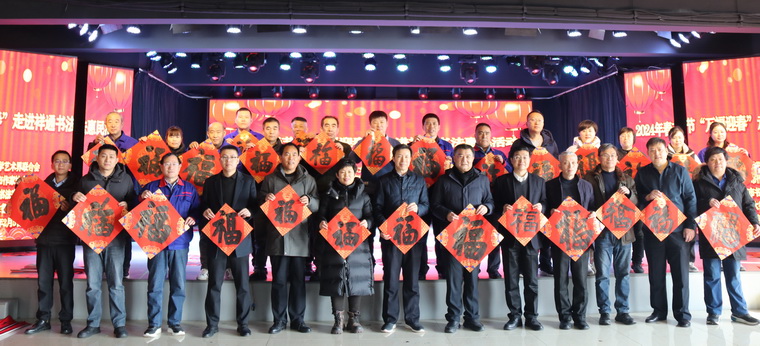 金兔留跡去,龍騰迎新春。2月5日,在甲辰龍年新春佳節(jié)來臨之際,為傳承中華優(yōu)秀傳統(tǒng)文化、營造歡樂祥和的節(jié)日氛圍,以書法藝術(shù)的形式,增強(qiáng)職工群眾文化獲得感、幸福感,由濟(jì)寧市文聯(lián)、濟(jì)寧市作協(xié)、濟(jì)寧市書協(xié)、大魯藝書畫院共同主辦的“2024年春節(jié)‘萬福迎春’走進(jìn)祥通書法惠民活動”在祥通多功能廳成功舉行。濟(jì)寧市文聯(lián)黨組書記、主席張作昌,濟(jì)寧市文聯(lián)黨組成員、副主席黃秀杰;濟(jì)寧市書協(xié)主席謝長偉,中國書協(xié)會員、濟(jì)寧市書協(xié)秘書處成員高衛(wèi)兵,濟(jì)寧市女書畫家協(xié)會秘書長晉丹;濟(jì)寧市作協(xié)主席張建魯,副主席范金泉、副秘書長周中祥,濟(jì)寧經(jīng)開區(qū)作協(xié)副主席紀(jì)秀目;大魯藝書畫院黨支部書記、常務(wù)副院長張瑞祥,大魯藝書畫院副院長王盡文、王大中,兗州區(qū)文聯(lián)原主席張金鵬和祥通職工代表、媒體記者齊聚一堂,現(xiàn)場題寫春聯(lián)福字,喜迎龍年春節(jié)。